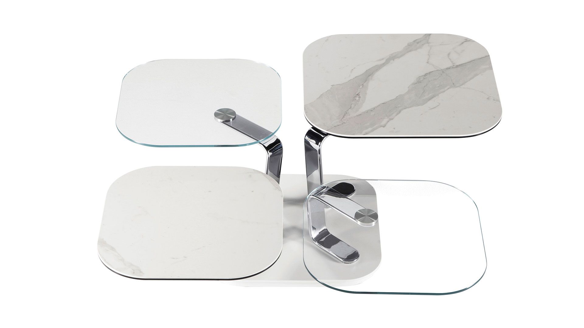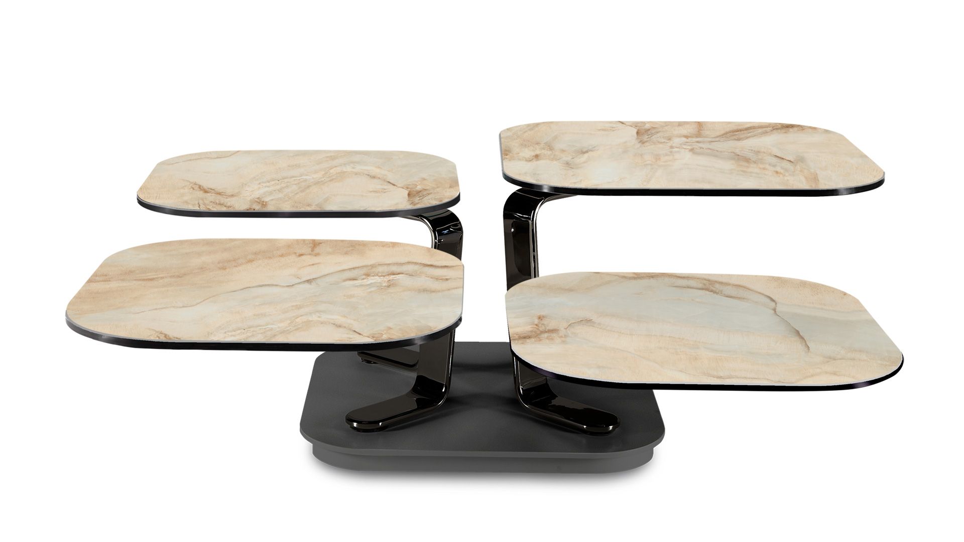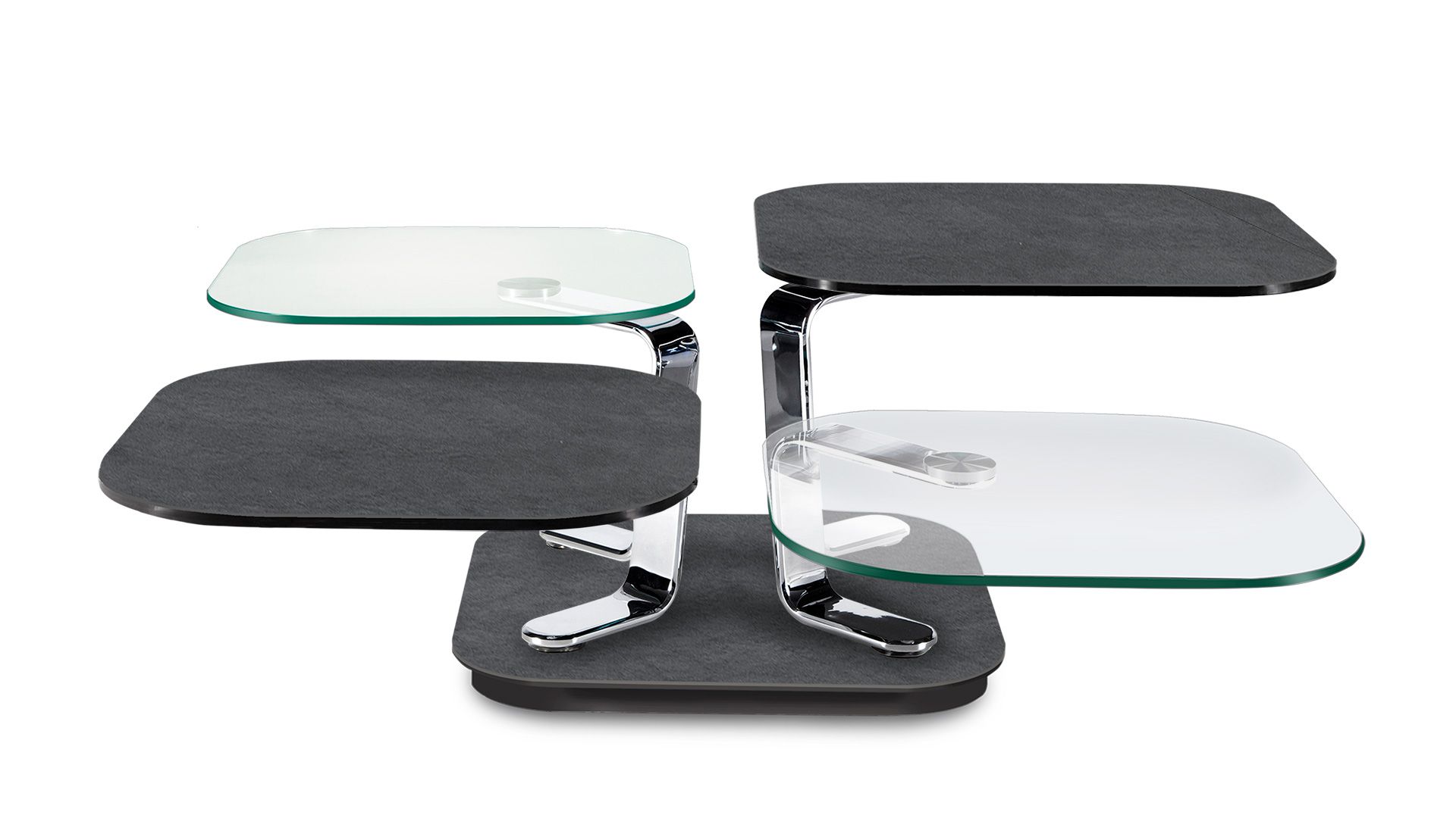 Couchtisch mit vier synchron drehbaren Platten aus Glas oder Keramik. In verschiedenen Ausführungen erhältlich.