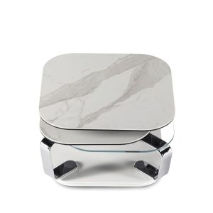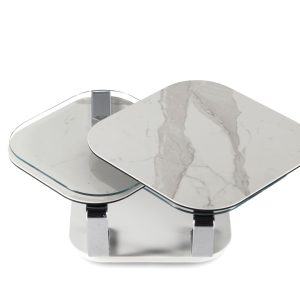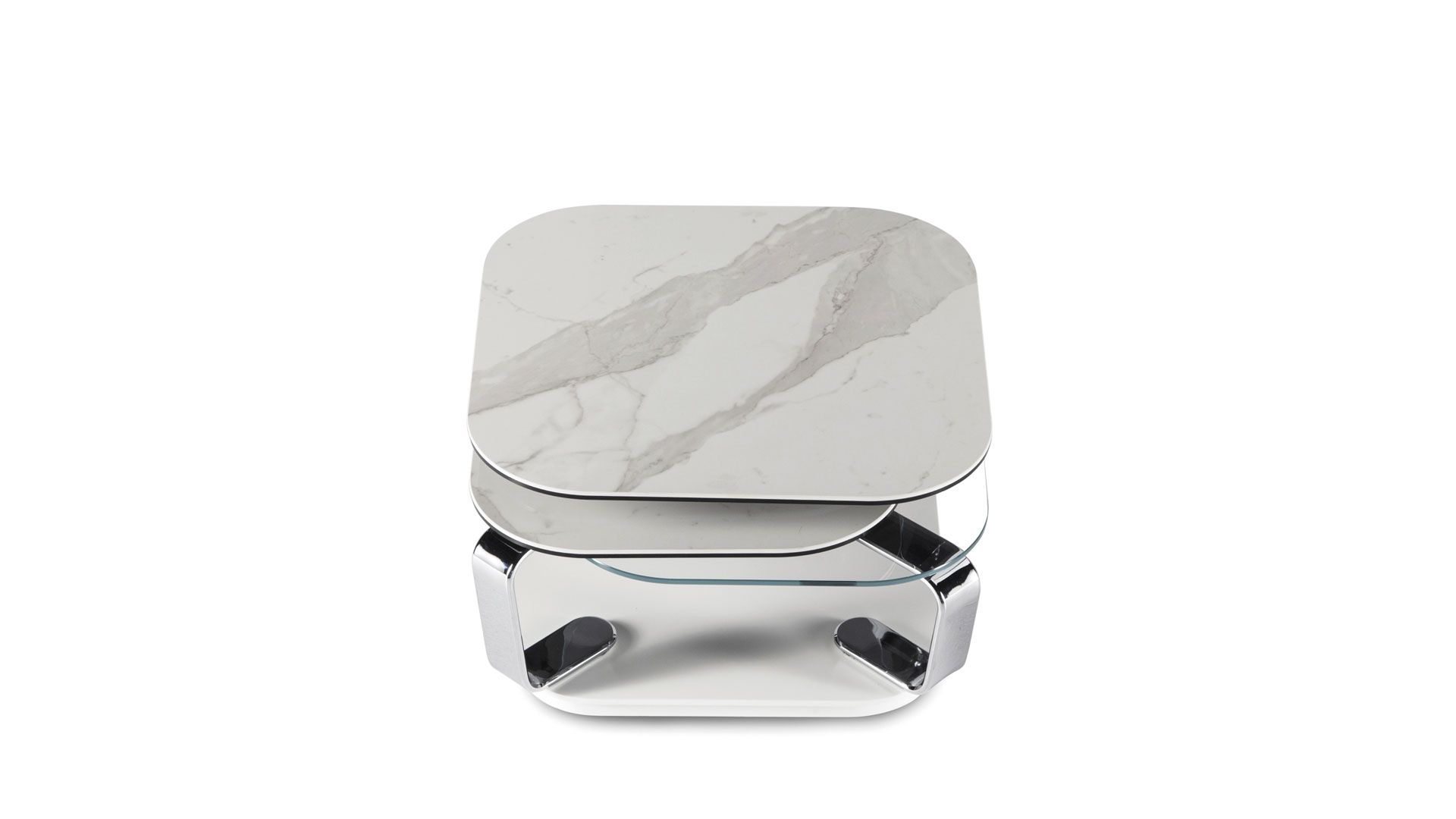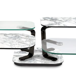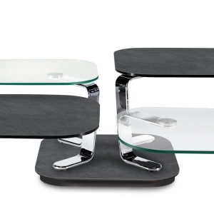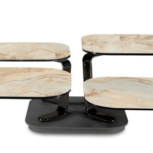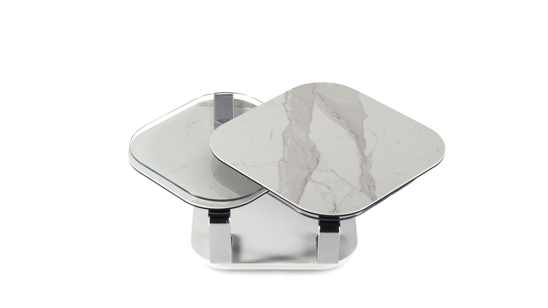 Couchtisch mit vier synchron drehbaren Platten aus Glas oder Keramik. In verschiedenen Ausführungen erhältlich.