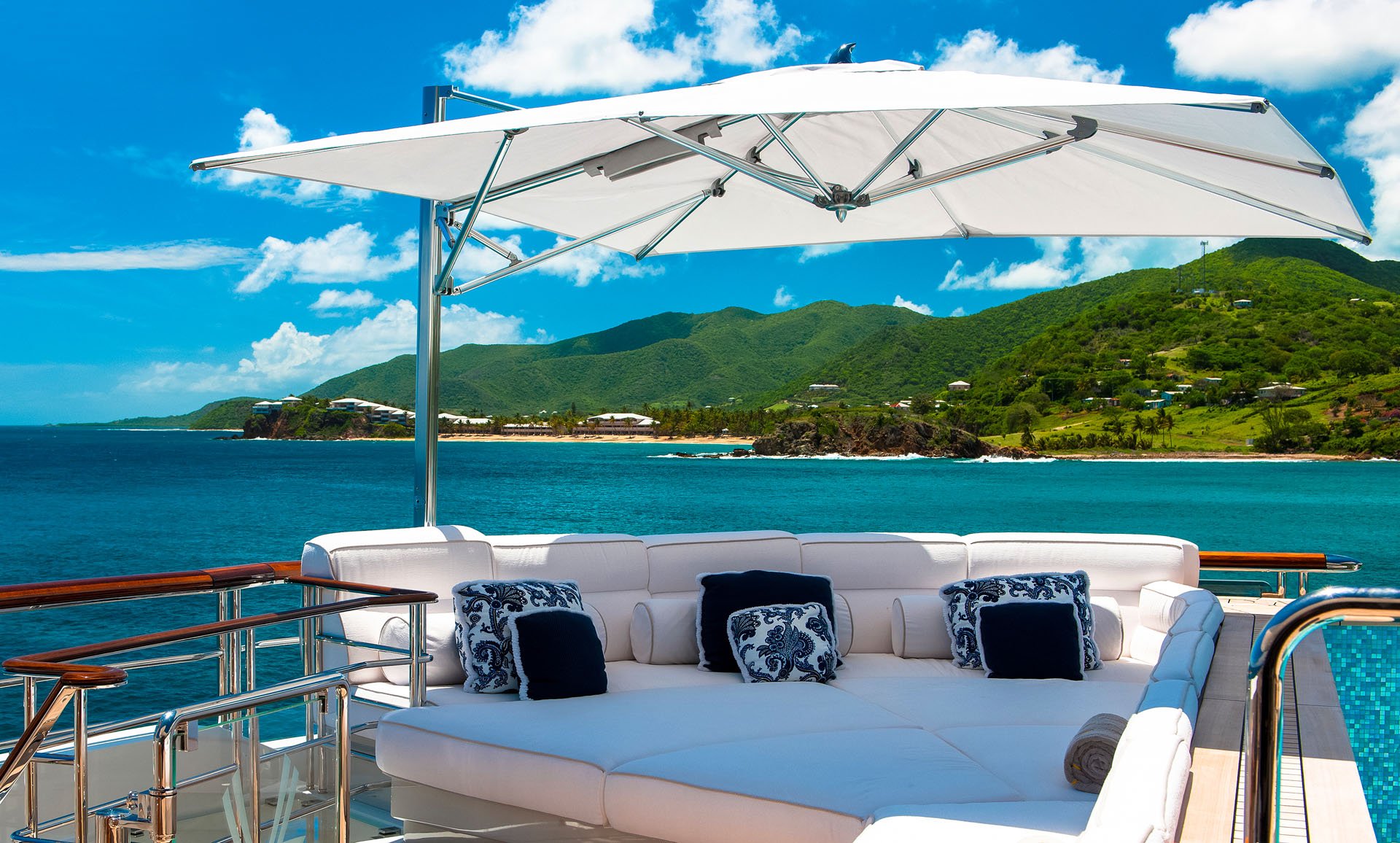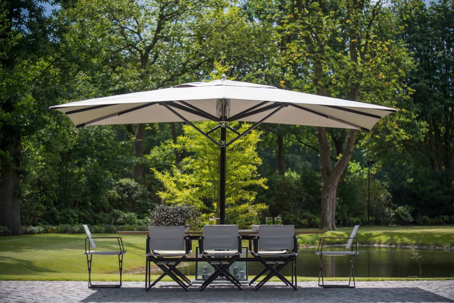Hoogwaardige parasol. Het gepolijste frame zweeft aan een stevige, ovaalvormige mast, afgekeken van zeiljachten. Dankzij de combinatie van een supersterke aluminium draaispil en een automatische telescopische mast sluit het doek van deze parasol gemakkelijk over tafels en stoelen.